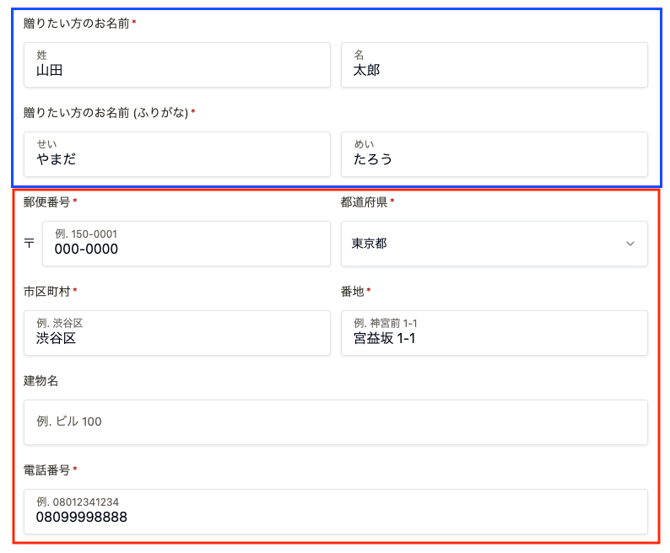 ギフトボックス送付先記入方法 ギフトボックス送付先記入方法は、お渡し方法によって記入が異なります。①贈りたい相手先に発送する場合②ご自身で受け取り、後日手渡しの場合※ギフトボックスを手渡しでお贈りしたい場合、ご自身で先に受け取りをしていただくことも可能です。 ①贈りたい相手先に発送する場合 青枠部分:お贈り先の方のお名前 赤枠部分:お贈り先の方の住所、電話番号 ②ご自身で受け取り、後日手渡しの場合 青枠部分:お贈り先の方のお名前 赤枠部分:お受け取りされるご自身の住所、電話番号